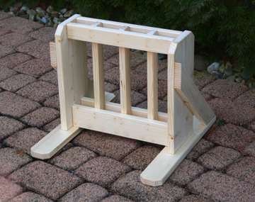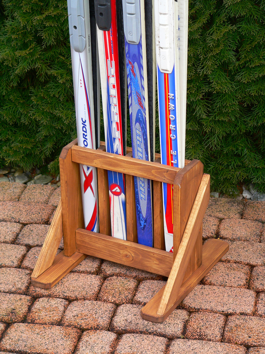 Praktický, skladný, volně stojící, přenosný dřevěný stojan na 4 páry běžeckých lyží s patkami širokými až 6 cm vyrobený ze smrkového masivu. Stojan je stabilní, bez nutnosti fixace k podlaze. Stojan je vhodný pro použití na chatách, chalupách, ski půjčovnách, atd. Vzhledem k malým rozměrům není problém jej umístnit v garáži, předsíni, terase, balkoně apod. Stojan má odtokové otvory pro tající sníh.