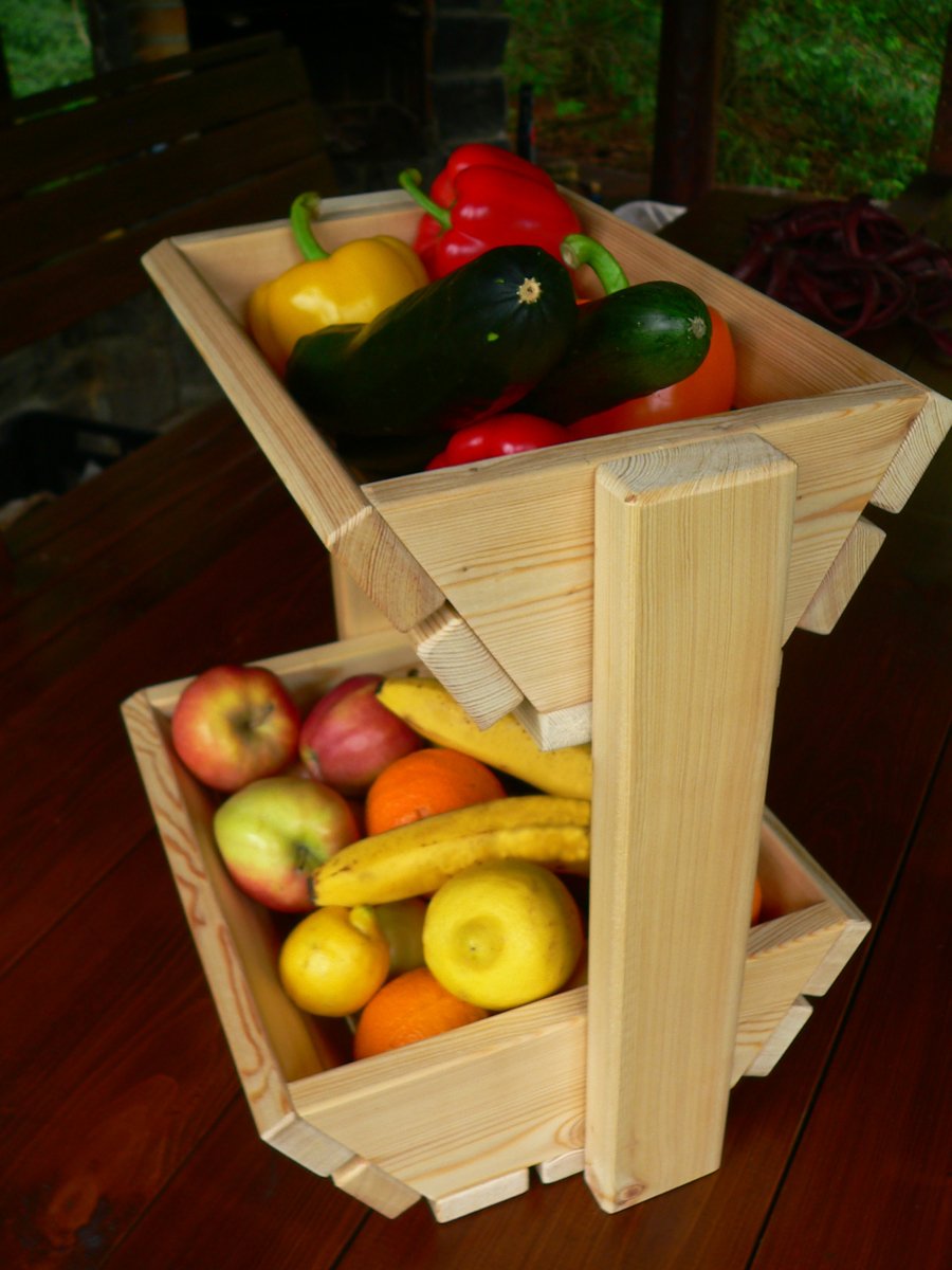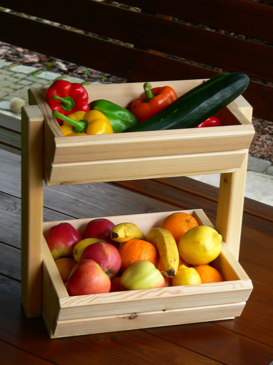 Dvoupatrový kuchyňský dřevěný stojan na ovoce a zeleninu vyrobený z masivu sibiřského modřínu.