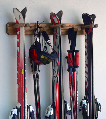 Stylový dřevěný nástěnný držák pro 3 páry lyží a hůlek vyrobený z masivu smrku a buku. Délka kolíku 14 cm a jejich vzdálenost 2 cm umožnuje pověšení různych typů lyží. Ideální pro instalaci v předsíni, garáží a pod. Jednoduchá montáž, vruty,hmoždinky a dřevěné krytky otvorů jsou součástí zásilky.