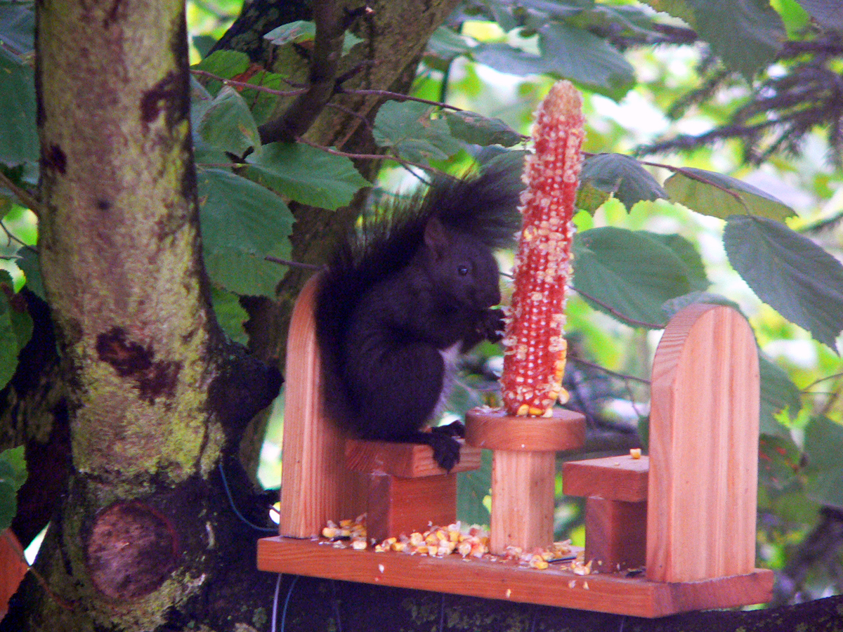 Krmítko pro veverky umožní udržet si veverky ve Vaší zahradě. Konstrukce krmítka má formu stolu s dvěma židlemi. Na stole je vrut na který se napichuje kukuřičný klas. Krmítko se připevní na horizontální větev stromu pomoci vázacích pásků, které jsou součásti dodávky.