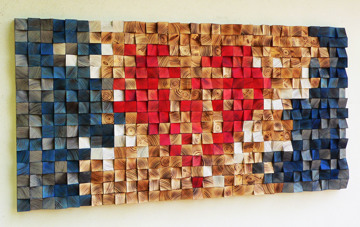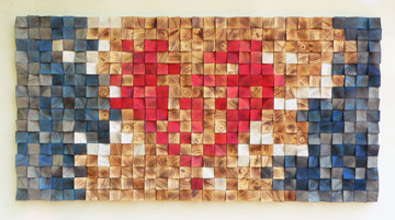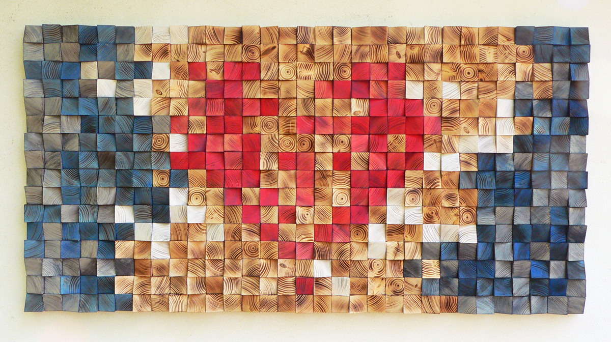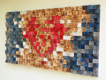Nástěnná 3D dekorace vyrobena ze smrkových  dřevěných kostiček. Každá kostička je ručně vyřezaná, obroušená, opálená a barevně upravená. Ošetřeno nezávadným bezbarvým akrylovým lakem. Unikátní design, každý kus je nezaměnitelný originál. Závésný systém v ceně. Vhodná do kancelářkých prostor, obyvacích prostor a pod.