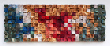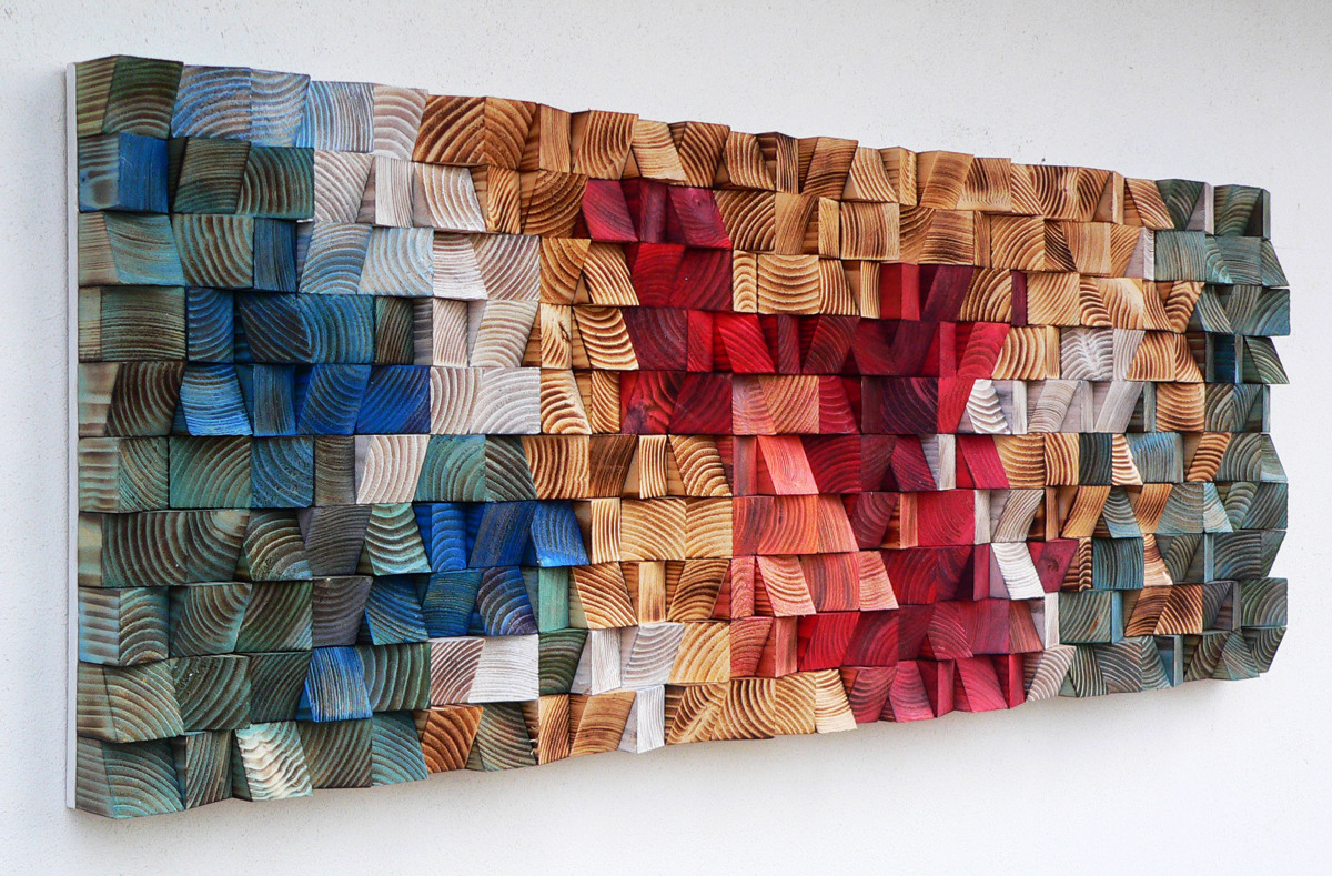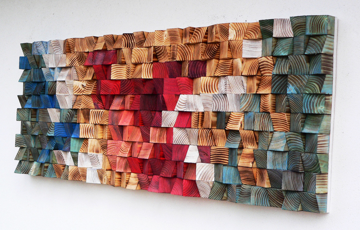 Nástěnná 3D dekorace vyrobena ze smrkových dřevěných kostiček. Každá kostička je ručně vyřezaná, obroušená, opálená a barevně upravená. Ošetřeno nezávadným bezbarvým akrylovým lakem. Unikátní design, každý kus je nezaměnitelný originál. Závésný systém v ceně. Vhodná do kancelářkých prostor, obyvacích prostor a pod.