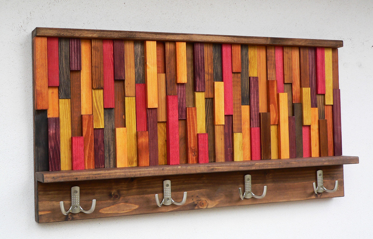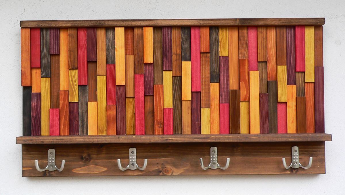 Moderní designový věšák VERTI s odkládací poličkou je zhotovený z masivu sibiřského modřínu a smrku s kováním Hettich. Jedná se o zakázkovou výrobu, každý kus je originál.
