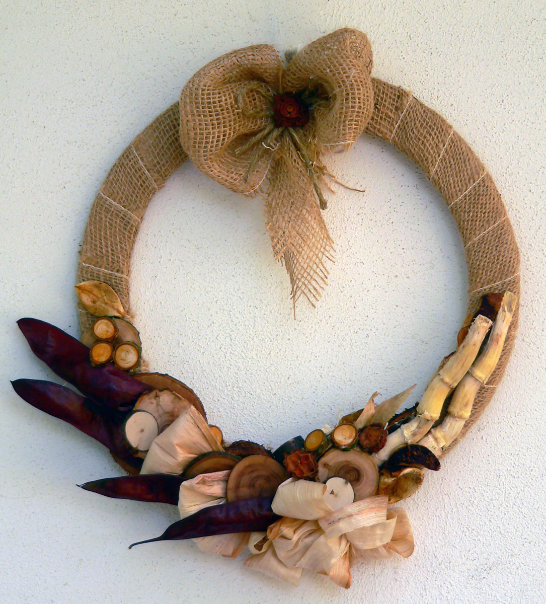Přírodně nazdobený podzimní věnec s průměrem 35 cm.