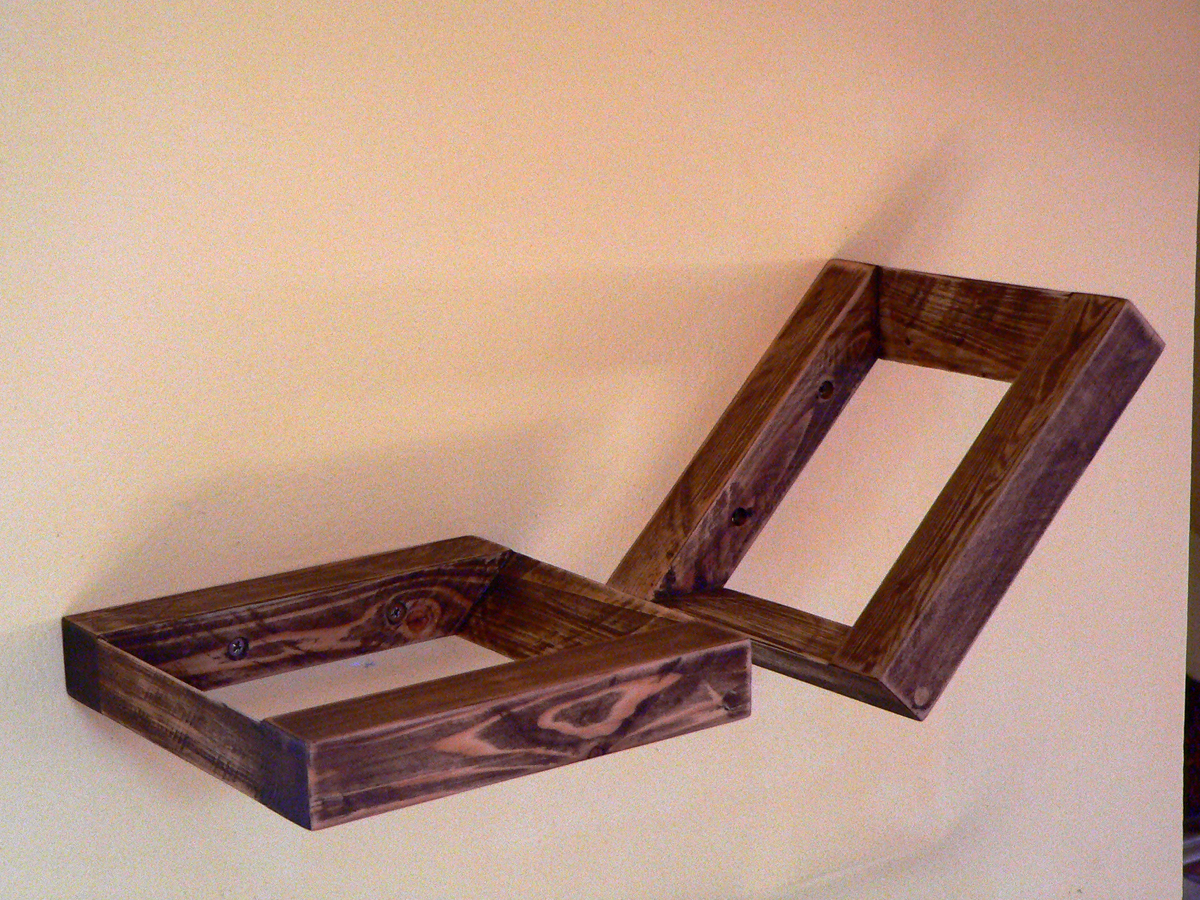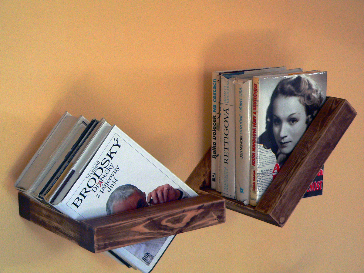 Moderní a praktická sada 2 poliček na knihy nebo DVD. Poličky jsou vyrobeny z masivu sibiřského modřínu a díky neobvyklé konstrukci umožňují atypické a atraktivní uložení knih nebo DVD. Poličky lze připevnit buď pod pod úhlem 45 stupňů nebo horizontálně případně i pod jiným úhlem. Kombinací několika poliček lze na stěně vytvořit neobvykle uspořádanou knihovnu.