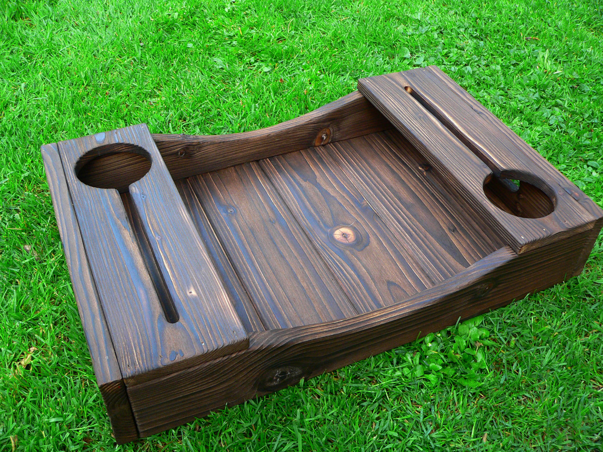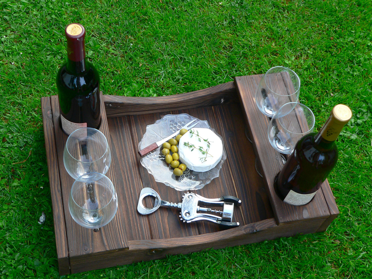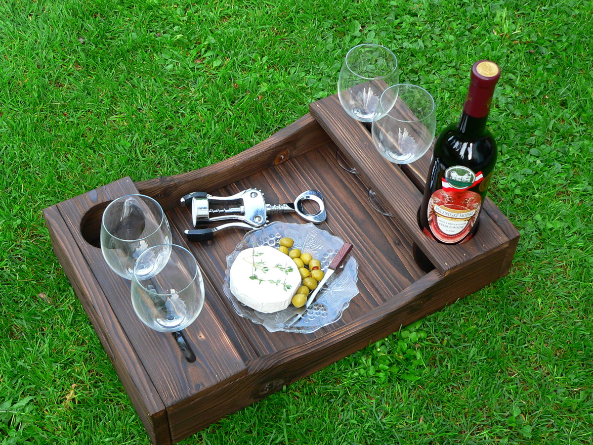 Dřevěný, ručně vyráběný podnos Lux pro servírování vína a pohoštění. Určený pro standartní sklenice na víno a láhve 0,7l. Umožňuje bezpečné přenášení až 2 lahví vína a 4 sklenic na víno bez hrozby převrhnutí.