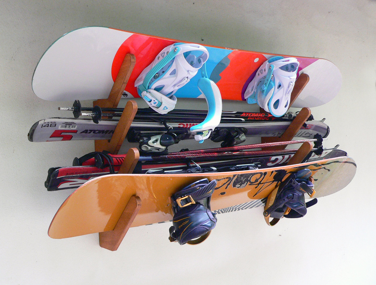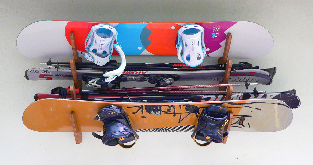 Univerzální držák na sjezdové lyže, běžky a snowboardy. Držák umožňuje horizontální uložení libovolné kombinace 4 párů sjezdových a běžeckých lyží anebo 2 párů lyží a 2 snowboardů. Je vyroben z prvotřídní bukové překližky, tl.18 mm. Jednoduchá montáž. Ideální pro chaty, pensiony, ubytovny, předsíně, garáže, atd.