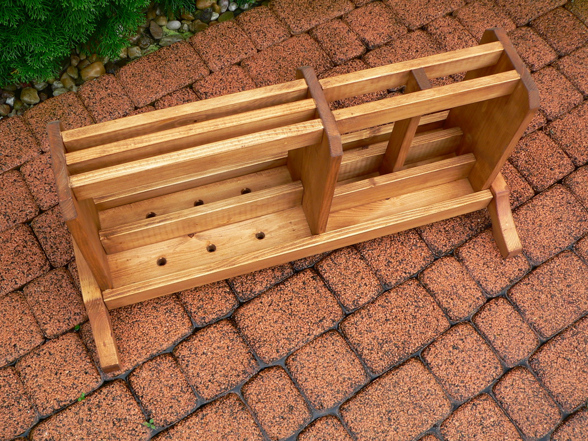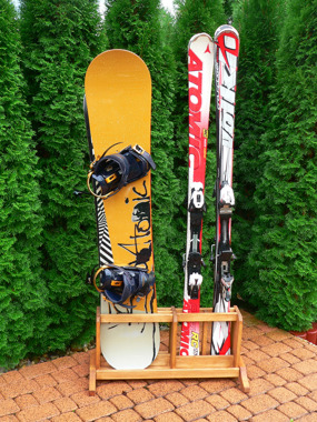Praktický, skladný, volně stojící, přenosný dřevěný stojan na 2 páry lyží s patkami širokými až 14 cm a 2 snowboardy s patkami širokými až 35 cm vyrobený ze smrkového masivu. Stojan je stabilní, bez nutnosti fixace k podlaze. Stojan je vhodný pro použití na chatách, chalupách, ski půjčovnách, atd. Vzhledem k malým rozměrům není problém jej umístnit v garáži, předsíni, terase, balkoně apod. Stojan má odtokové otvory pro tající sníh.