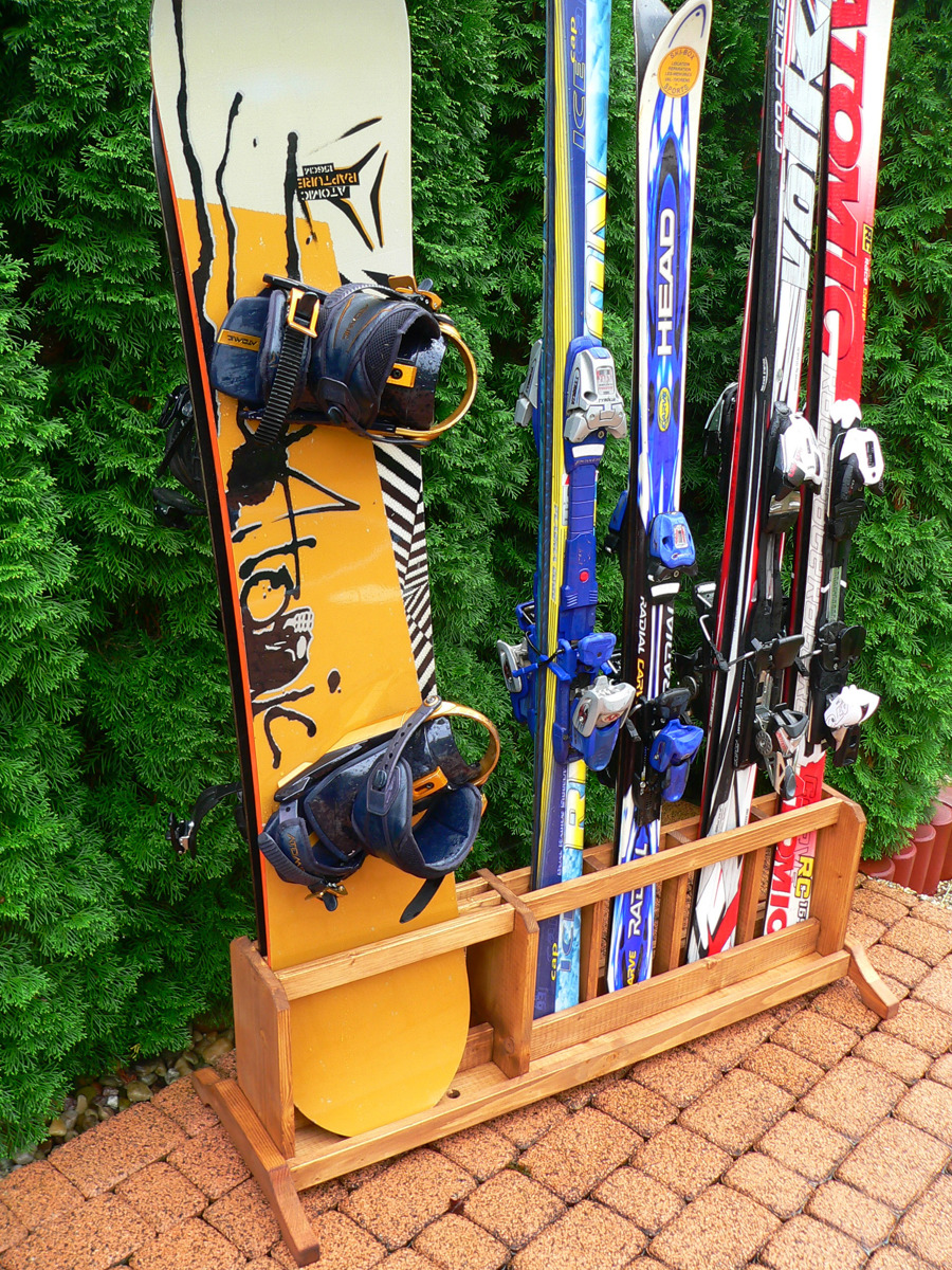 Praktický, skladný, volně stojící, přenosný dřevěný stojan na 4 páry lyží s patkami širokými až 14 cm a 2 snowboardy s patkami širokými až 35 cm vyrobený ze smrkového masivu. Dodat lze i variantu pro 4 snowboardy a 2 páry lyží. Stojan je stabilní, bez nutnosti fixace k podlaze. Stojan je vhodný pro použití na chatách, chalupách, ski půjčovnách, atd. Vzhledem k malým rozměrům není problém jej umístnit v garáži, předsíni, terase, balkoně apod. Stojan má odtokové otvory pro tající sníh.