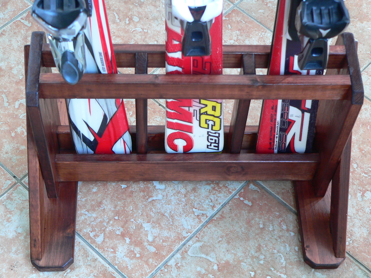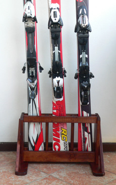 Praktický, skladný, volně stojící, přenosný dřevěný stojan na 3 páry lyží s patkami širokými až 14 cm vyrobený ze smrkového masivu. Stojan je stabilní, bez nutnosti fixace k podlaze. Stojan je vhodný pro použití na chatách, chalupách, ski půjčovnách, atd. Vzhledem k malým rozměrům není problém jej umístnit v garáži, předsíni, terase, balkoně apod.