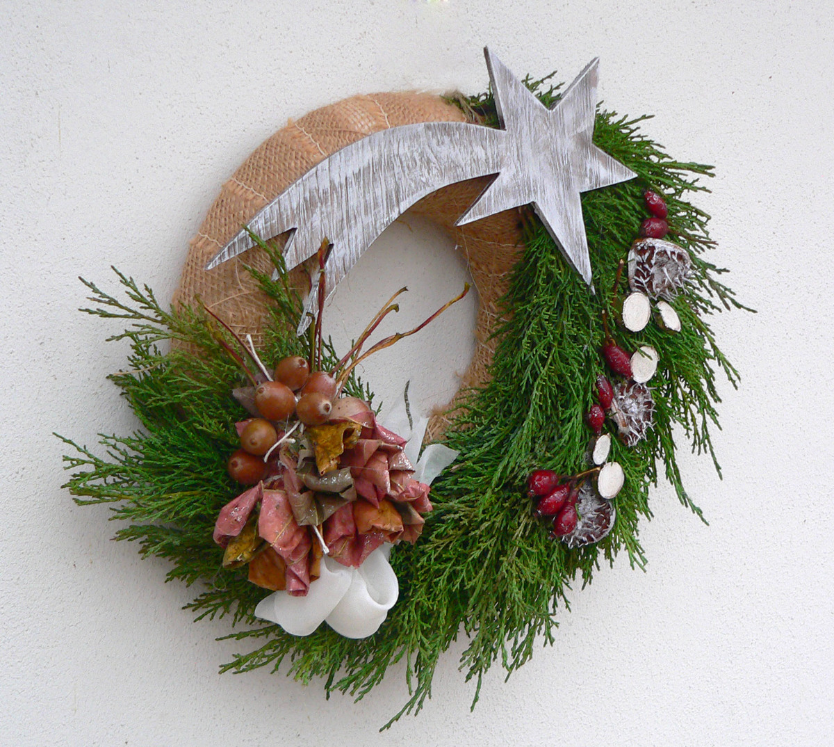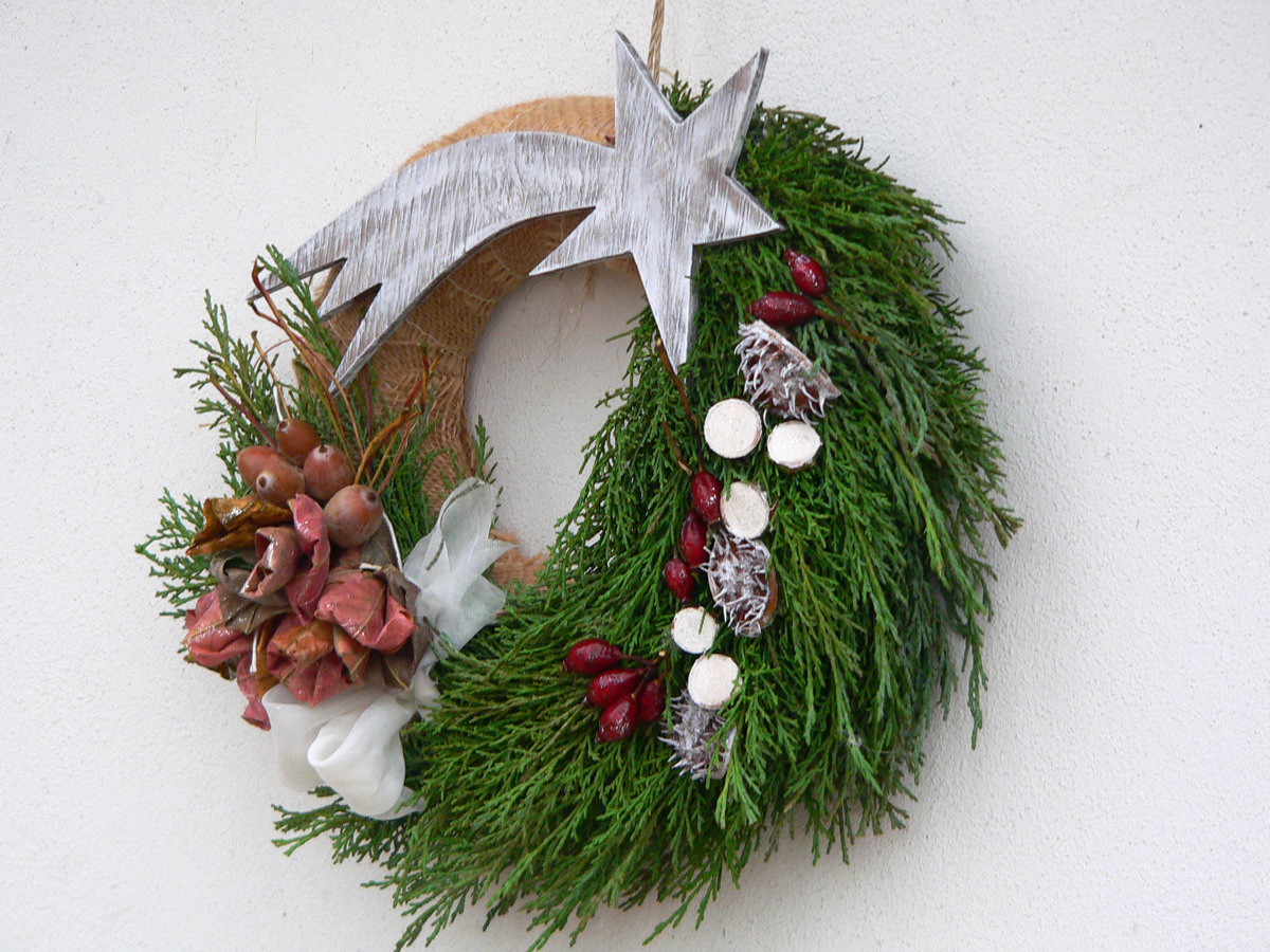 Přírodně nazdobený dekorační vánoční věnec s průměrem 30 cm.
