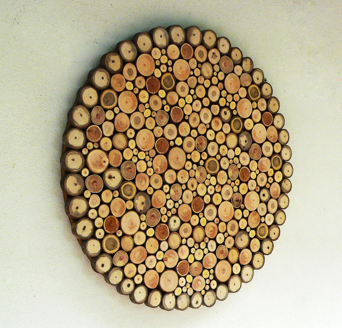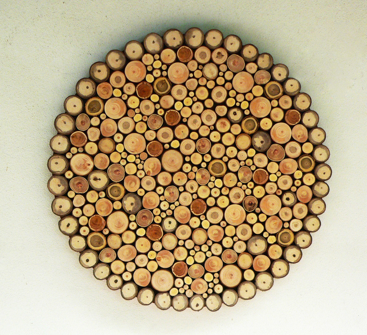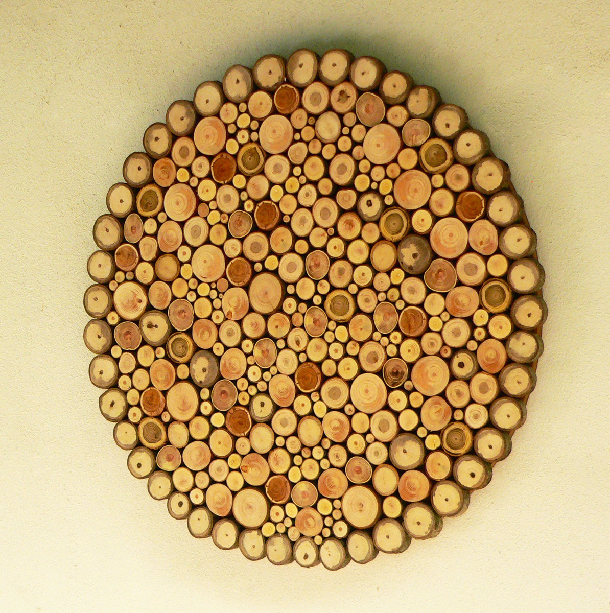 Nástěnná 3D dekorace vyrobena z plátků větví ovocných dřevin a bukové překližky. Ošetřeno nezávadným bezbarvým akrylovým lakem. Unikátní design, každý kus je nezaměnitelný originál. Závěsný systém v ceně. Vhodná do kancelářkých prostor, obyvacích prostor a pod.